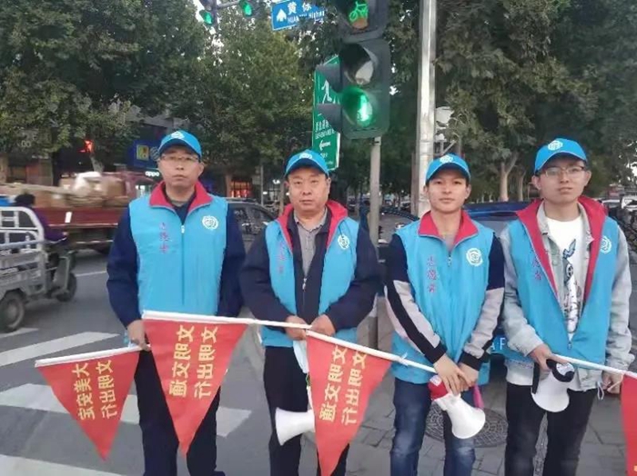 在開展文明交通勸導(dǎo)過程中,青年志愿者們身穿醒目的反光背心,戴好防護(hù)口罩,手持“文明交通從我做起”引導(dǎo)旗,配合路口執(zhí)勤交警和協(xié)管員維護(hù)交通秩序。