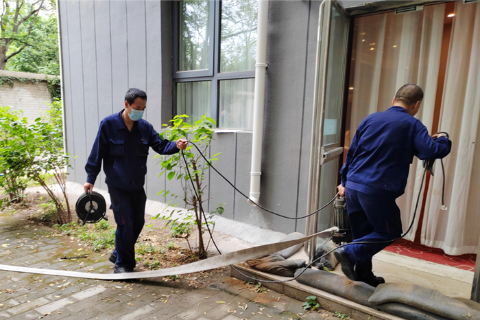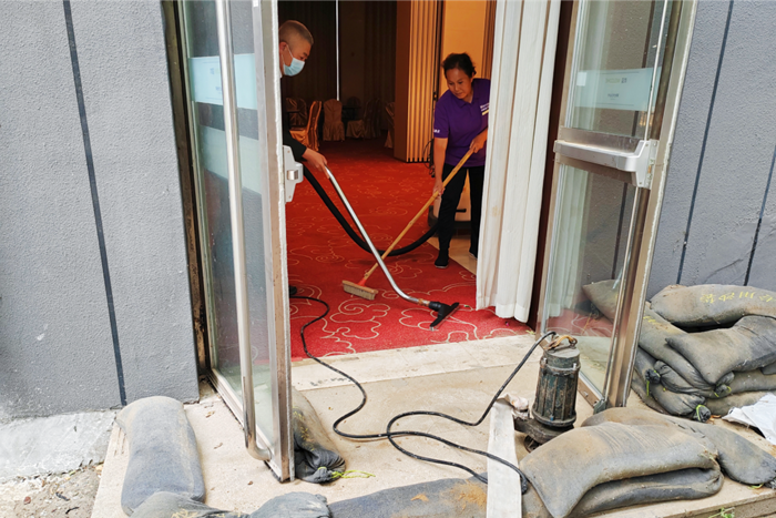 接到指令的工程部人員攜帶搶險(xiǎn)排澇設(shè)備:潛水泵、防水線軸、排水水帶趕到現(xiàn)場,迅速開展排澇搶險(xiǎn)工作;接到搶險(xiǎn)指令的客房部人員攜帶吸水機(jī)、舊布草、拖把隨即到達(dá)現(xiàn)場,對(duì)室內(nèi)殘存的積水進(jìn)行了處理。最終,在參與搶險(xiǎn)的各部門人員的通力合作下,“內(nèi)澇險(xiǎn)情”得到了有效控制,保護(hù)了酒店財(cái)產(chǎn)不受損失。此次演練圓滿成功,達(dá)到了預(yù)期效果。