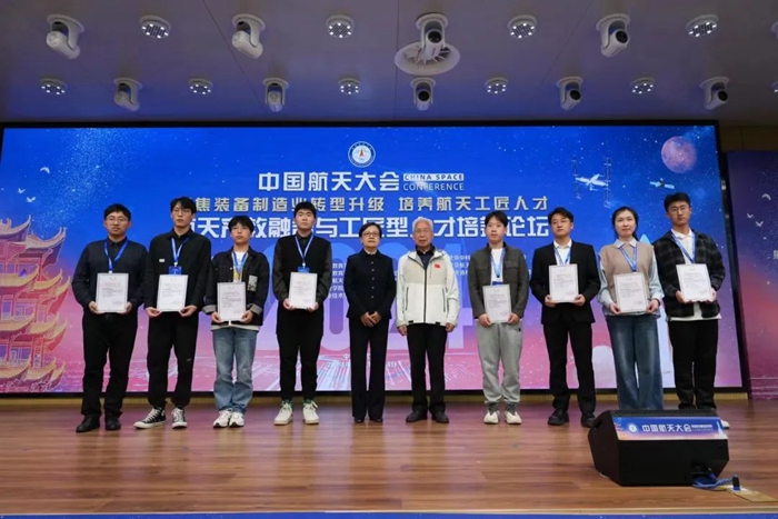 “五一”勞動節(jié)前夕,在武漢召開的中國航天大會“全國職業(yè)院??破招l(wèi)星研制工程邀請賽”頒獎儀式上,中國職業(yè)技術(shù)教育學(xué)會會長、教育部原副部長魯昕為技師學(xué)院獲獎選手代表邱世龍頒獎,并與中國運載火箭技術(shù)研究院龍樂豪院士一同和獲獎選手合影留念。