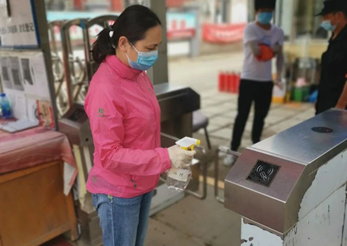 集團總部 時建秀 在工作區(qū)域噴灑酒精進行崗前消毒
