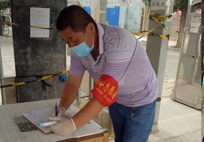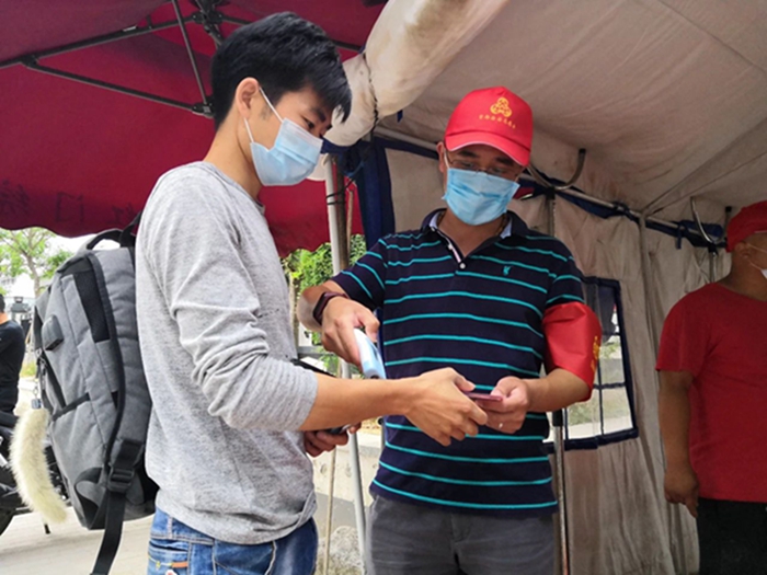 華騰丹陛華 朱海波 在村卡口為進出人員測量體溫