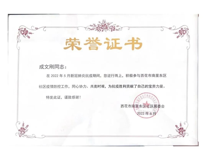 近日,東城區(qū)西花市南里東區(qū)社區(qū)居委會為化研院共產(chǎn)黨員成文剛頒發(fā)了榮譽證書,以表彰他積極參加社區(qū)防控工作。