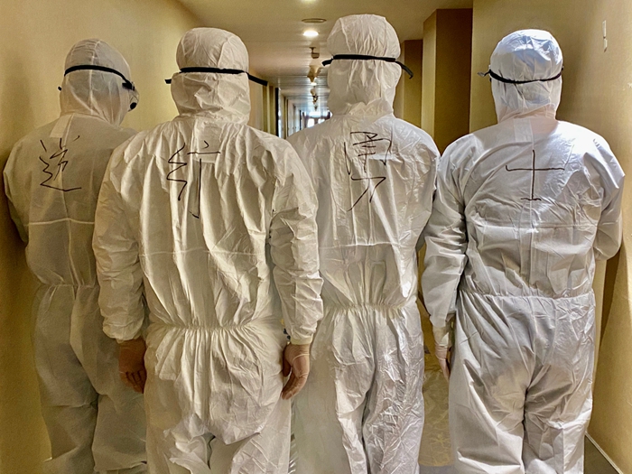 這樣的默默堅(jiān)守,在我們一線服務(wù)人員身上更得到充分彰顯。在紅區(qū)工作的13名服務(wù)人員,每天要穿著厚厚的防護(hù)服為集中觀察人員送餐、送物品、搞清潔衛(wèi)生。每天,他們要全副武裝穿上防護(hù)服,并嚴(yán)格按照要求進(jìn)行消殺。要一個(gè)房間一個(gè)房間地配送餐食,送餐完畢,還要一個(gè)房間一個(gè)房間地收納垃圾。由于防護(hù)服不透氣,剛一行動(dòng)起來,他們已經(jīng)渾身是汗,但是他們每次都保質(zhì)保量按時(shí)完成了任務(wù)。請記住他們的名字:崔濤、陳宇、翟明星、于艷梅、任艷麗、吳迪、崔加倫、劉克云、孫家俊、單雪芳、杜迪、楊魯琦、侯迪。