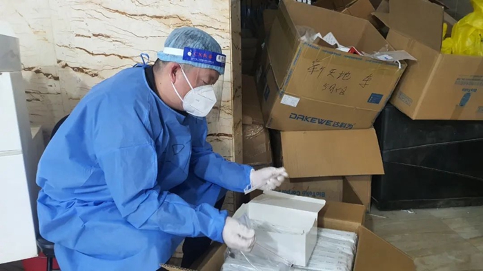 不等社區(qū)同志手把手教,我就掌握了穿脫防護服、84消毒液配比等工作的方法,又經(jīng)現(xiàn)場緊急培訓(xùn)學(xué)習(xí)了維持秩序、身份信息登記、開箱封箱等方法。很快我就上手開始了緊張而忙碌的工作。