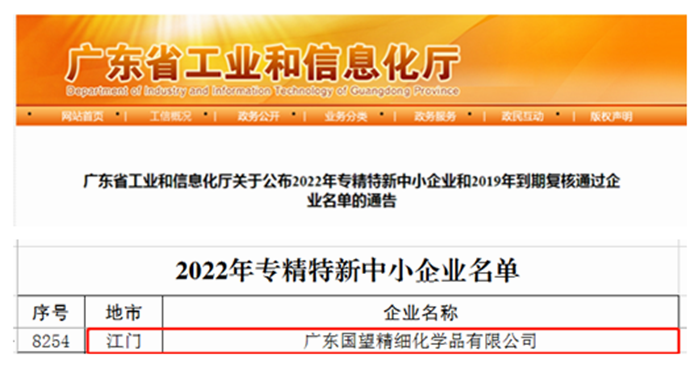 春節(jié)前夕,從廣東傳來好消息,華騰新材所屬廣東國望精細化學品有限公司成功入選廣東省2022年“專精特新”中小企業(yè)名單,成為北京化工集團第6家“專精特新”企業(yè)。